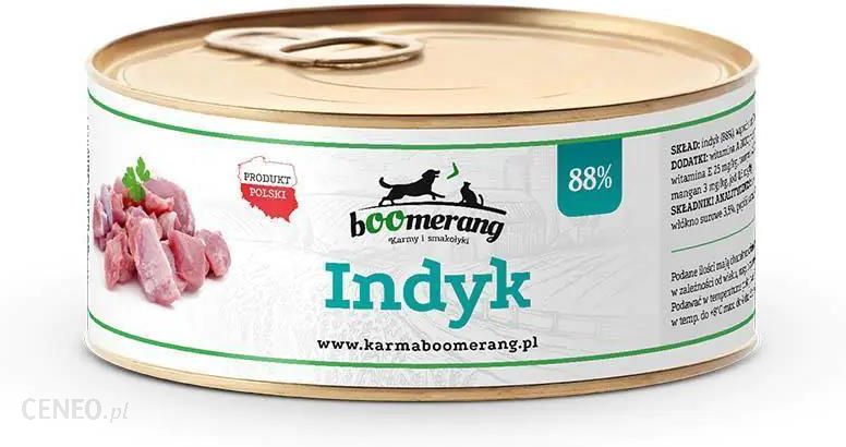 Uzupełniająca mokra Karma bOOmerang dla dorosłych kotów na bazie indyka.Hippoalergicznaskomponowana w 88% na podstawie mięsa z indykaPełnowartościowe białkobogactwo aminokwasów oraz niska zawartość tłuszczuBiałko makroskładnikoweoddziałuje pozytywnie na procesy regeneracyjne po wysiłkuBogata w witaminyA, E, D oraz witamin z grupy BWartościowe białko z indykaHipoalergiczna karma skomponowana w 88% na podstawie mięsa z indyka dostarcza wszystkie najważniejsze wartości odżywcze, których potrzebuje Twój domowy tygrys.Indyk zawiera znacznie więcej białka niż inne rodzaje drobiu, w związku z czym znajduje się na czołowym miejscu w zestawieniu najbardziej wartościowych rodzajów mięs. Dodatkowo wykazuje się wysoką zawartością tzw. popiołu, czyli wartości mineralnych.Aminokwasy i niska zawartość tłuszczuMięso to charakteryzuje się dużą ilością pełnowartościowego białka, które wyróżnia się bogactwem aminokwasów oraz niską zawartością tłuszczu co sprawia, że jest idealne dla kotów mających tendencję do nadwagi. Niewielka ilość tłuszczu ma również pozytywny wpływ na poziom strawności karmy. Im mniej tłuszczu zawiera karma, tym jest bardziej lekkostrawna. Dodatkowo białko pochodzące z indyka jest hipoalergiczne, co oznacza, że bardzo rzadko wywołuje reakcję alergiczną.Witaminy i minerałyIndyk charakteryzuje się dużą ilością witamin, przede wszystkim witamin z grupy B, a także żelaza, magnezu, cynku, selenu, miedzi oraz potasu. Wysoka zawartość żelaza wspomaga wytwarzanie hemoglobiny, co zapobiega anemii, która może wystąpić z wiekiem.Karma bOOmerang na bazie indyka zawiera również wątrobę drobiową, która jest prawdziwą bombą składników odżywczych. Stanowi ona cenne źródło białka makroskładnikowego, dzięki czemu wspiera funkcjonowanie organizmu. Witaminy B6 oraz B12, są odpowiedzialne za wytwarzanie czerwonych krwinek, poprawną pracę układu nerwowego, metabolizm, a także pracę mózgu. Zawiera również biotynę, żelazo, kwas foliowy, selen, miedź, cynk, magnez, potas oraz wapń. Wspomaga utrzymanie odpowiedniej masy mięśniowej, co z wiekiem staje się trudniejsze.Białko makroskładnikoweBiałko makroskładnikowe oddziałuje pozytywnie na procesy regeneracyjne po wysiłku, wzrost oraz rozwój od najmłodszych lat. Zapewnia równowagę hormonalną, dba o poprawną kondycję skóry, sierści i pazurów. Wątroba drobiowa jest również dobrym źródłem witaminy A, która będąc przeciwutleniaczem, pomaga w zwalczaniu wszelkich stanów zapalnych, których przyczyną są wolne rodniki.