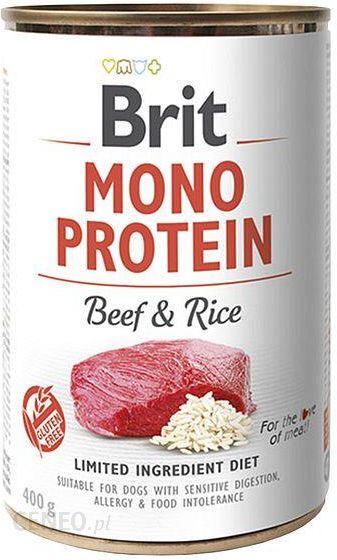Brit Mono Protein Beef & Rice 400GBRIT MONO PROTEIN BEEF & RICE PEŁNOPORCJOWA KARMA WILGOTNA Z WOŁOWINĄ I RYŻEM DLA PSÓW WSZYSTKICH RAS. ODPOWIEDNIA DLA PSÓW Z WRAŻLIWYM PRZEWODEM POKARMOWYM, ALERGIĄ I NIETOLERANCJĄ POKARMOWĄBez soi. Bez glutenu. Bez dodatku konserwantów i barwników. 100% czystego białka wołowego. Brit Mono Protein Beef & Rice zapewnia kompletne i zbilansowane żywienie z ograniczoną liczbą składników. Dzięki zastosowaniu jednego rodzaju białka jest to odpowiednia karma do zmniejszenia ryzyka alergii i nietolerancji pokarmowej. Puszkę należy podawać w temperaturze pokojowej. Dawkowanie karmy może różnić się w zależności od aktywności psa i środowiska, w którym żyje. Podając puszkę celem urozmaicenia i wzbogacenia smaku posiłków, należy odpowiednio pomniejszyć dzienną porcję karmy podstawowej. Należy zapewnić psu stały dostęp do świeżej wody.