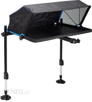 Duża półka z osłoną, łatwa w transporcie, pasująca do nóżek podestu wędkarskiego o śr. 25 mm i 36 mm. Osłona zdejmowana. Do ochrony przynęt przed słońcem i deszczem. Duża półka 60 cm x 45 cm. Nóżki do zamocowania na tylnym boku półki. 2 nóżki zapewniają stabilność. 3 pierścienie mocujące pasują do średnicy od 25 do 36 mm. 2 nóżki teleskopowe 60 – 90 cm. Pianka EVA na końcach półki.