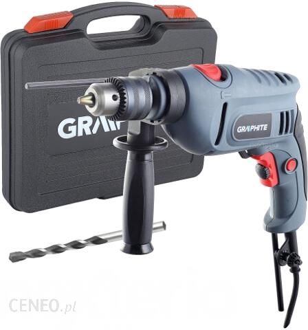 Graphite Wiertarka udarowa 650W 58G716Nowoczesna wiertarka udarowa GRAPHITE o dużej mocy 650 W. Wyposażona w 2 łożyska wiertarka doskonale poradzi sobie z materiałami, takimi jak drewno, tworzywa sztuczne, metal czy ceramika. Po przełączeniu na tryb pracy udarowej wiercenie w materiałach takich, jak beton lub cegła przebiegać będzie równie sprawnie. Wiertarka podczas wiercenia osiąga do 3000 obrotów na minutę, a po włączeniu udaru częstotliwość uderzeń dochodzi do 45000 w ciągu minuty. Ergonomiczna konstrukcja, niewielka waga urządzenia oraz długi przewód zasilający zdecydowanie ułatwią pracę w trudno dostępnych miejscach. Długotrwałą pracę w ciężkich warunkach ułatwi także funkcja blokady włącznika, dająca możliwość ciągłej pracy ze stałą prędkością. W zestawie z wiertarką znajduje się wiertło. Wiertarka objęta jest 24-miesięczną gwarancją. Marka GRAPHITE oferuje szeroki asortyment elektronarzędzi spełniających wymagania profesjonalistów.Dane techniczne:Graphite Wiertarka udarowa 58G716 o mocy 650W,uchwyt kluczykowy 13 mm,obroty 0-3000 min-1,częstość udaru 0-45000 min-1,maksymalna średnica wiecenia w drewnie/betonie/stali 25/13/10 mm,prawo/lewo, gwint wrzeciona 1/2’’x 20 mm,2 łożyska na osi wrzeciona,masa 1.88 kg.Elektronarzędzie posiada możliwość obrotu głowicy w prawo i lewo.