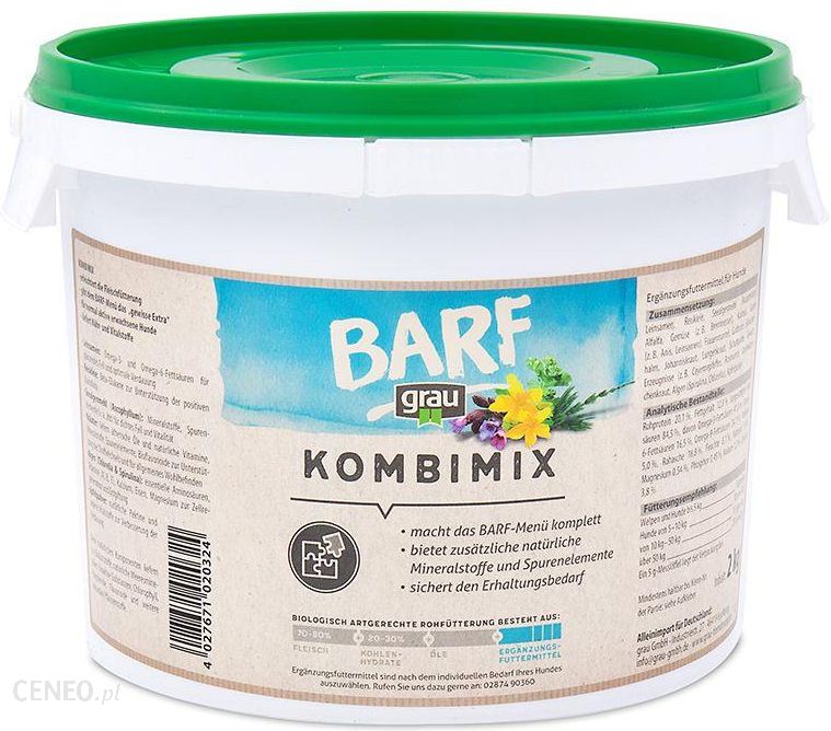 BARF to modna dieta, z którą mogą wiązać się trudności: inaczej niż w przypadku gotowej karmy pełnoporcjowej, musisz zadbać o kompleksowe dostarczenie składników odżywczych psu. Aby ułatwić Ci to zadania, powstał Grau BARF KombiMix. Ten pokarm uzupełniający nadaje się idealnie do wzbogacenia diety BARF o niezbędne dla psa substancje. Mieszanka zapewnia dostarczenie wszystkich składników odżywczych i substancji witalnych odpowiadających zapotrzebowaniom dorosłych, aktywnych psów. Produkt zawiera między innymi siemię lniane, różne algi, proszek jabłkowy oraz otręby owsiane oraz ważne minerały, witaminy i mikroelementy. Podanie produktu jest bardzo proste: wystarczy dodać odpowiednią ilość proszku do pokarmu i już nic nie stoi na przeszkodzie, aby podać zwierzęciu zbilansowany, bogaty w składniki odżywcze posiłek. Grau BARF KombiMix w skrócie: Pokarm uzupełniający dla psów. Uzupełnia posiłki: Mieszanka składników odżywczych do wzbogacenia diety BARF. Odpowiednia zawartość składników odżywczych: zawiera składniki witalne t.j. witaminy, pierwiastki śladowe, minerały w odpowiedniej dla dorosłego, aktywnego psa ilości. Kompleksowa pielęgnacja: odpowiednia podaż składników odżywczych. Wartościowe składniki: Siemię lniane: źródło kwasów tłuszczowych omega 3 i omega 6, mogących przyczynić się do pięknego wyglądu sierści i dobrego trawienia. Otręby owsiane: zawiera beta-glukan, mogą chronić florę bakteryjną jelit; Mączka z alg morskich: dostarcza składników mineralnych i mikroelementów; Algi: z chlorellą i spiruliną, źródło aminokwasów, witamin i minerałów; Proszek jabłkowy: zawiera naturalne pektyny, mogące wspierać trawienie. Ułatwia dietę BARF: idealne rozwiązanie dla właścicieli, którzy polegają na żywieniu mięsem i chcą mieć pewność, że ich pies spożywa wystarczającą ilość składników odżywczych. Praktyczny proszek: może zostać wymieszany z pokarmem.