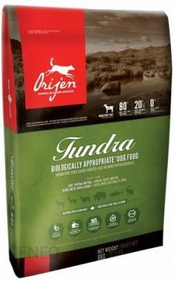 *Orijen Tundra* to pełnoporcjowa sucha karma przeznaczona dla psów wszystkich ras, bez względu na wiek (zarówno dla szczeniąt, psów dorosłych jak i starszych).*Orijen Tundra* to biologicznie odpowiednia karma bezzbożowa zawierająca aż 85% składników mięsnych. W składzie znajdziemy min. mięso kozy, dzika, jelenia, świeży golec zwyczajny, mięso kaczki, baraninę oraz świeże ryby, a aż 2/3 jej składników mięsnych to mięso świeże lub surowe. Z kolei pozostała 1/3 składników mięsnych to mięsa dehydratyzowane. Ponadto, karma charakteryzuje się wysoką zawartością bogato odżywczego białka – 40%. Składniki karmy dostarczane są codziennie świeże w odpowiednich proporcjach WholePrey™.*Skład:* Świeże mięso kozy (5%), świeże mięso dzika (5%), świeże mięso jelenia (5%), świeży golec zwyczajny (5%), świeże mięso kaczki (5%), świeża wątroba dzika (5%), świeża wątroba kaczki (5%), świeża baranina (4%), świeży pstrąg tęczowy (4%), świeże nerki dzika (4%), cała makrela (dehydratyzowana, 4%), świeże całe sardynki (4%), jagnięcina (dehydratyzowana, 4%), baranina (dehydratyzowana, 4%), dorsz (dehydratyzowany, 4%), cały błękitek (dehydratyzowany, 4%), cały śledź (dehydratyzowany, 4%), cała czerwona soczewica, cała zielona soczewica, cały groch zielony, cała ciecierzyca, cały groch żółty, cała fasola pinto, włókno soczewicy, tłuszcz kaczki (1,5%), świeże żołądki baranie (1,5%), olej ze śledzia (1%), świeże serce kozy (1%), świeże nerki kozy (1%), świeża wątroba kozy (1%), świeża wątroba jelenia (0,5%), świeże serce jelenia (0,5%), świeża wątroba barania (0,5%), świeże serce dzika (0,5%), cała fasola biała, wątroba kozy (liofilizowana), wątroba jelenia (liofilizowana), świeża cała dynia, świeża cała dynia piżmowa, świeża cała cukinia, świeży cały pasternak, świeża marchew, świeże całe jabłka red delicious, świeże całe gruszki bartlett, świeży jarmuż, świeży szpinak, świeże liście buraków, świeże liście rzepy, brązowy kelp, cała żurawina, całe borówki, korzeń cykorii, kurkuma, korzeń sarsaparyli, korzeń prawoślazu lekarskiego, owoce dzikiej róży, jagody jałowca.*Składniki analityczne:* Białko surowe 40%, Oleje i tłuszcze surowe 18%, Popiół surowy 9%, Włókno surowe 5%, Wilgotność 12%, Wapń/Fosfor 1.8% / 1.3%, Omega-6/3 2.5% / 1%, DHA/EPA 0.35% / 0.2%, Glukozamina/Chondroityna 600 mg/kg / 800 mg/kg.