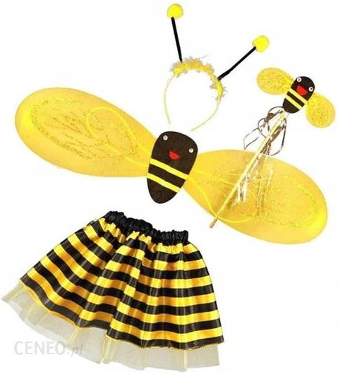 STRÓJ PSZCZÓŁKA 4 EL.Zestaw zawiera:spódniczkę,skrzydełka,opaskę,różdżkę.Spódniczka w czarno-żółte paski. Na gumce.Wymiary:szerokość w pasie: 23-37 cm,długość: ok. 29 cm.Skrzydełka półprzezroczyste na szelkach z gumki. Zdobione złotym brokatem.Rozstaw: ok. 69 cm.Elastyczna opaska na głowę z grzebykiem. Do opaski doczepione są czułki zakończone żółtymi pomponikami.Różdżka o długości ok. 35 cm. Zdobiona miniaturową pszczółką oraz satynowymi wstążeczkami.Na pozostałych naszych aukcjach oferujemy:szeroki wybór strojów dla dzieci i dorosłych, a także maski, peruki, nakrycia głowy oraz akcesoria dekoracyjne.Strój pszczółka maja gucio pszczoła owad
