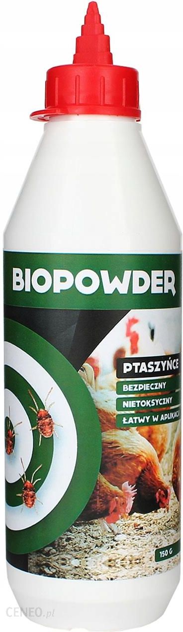BIOPOWDER – EKOLOGICZNY PREPARAT DO ZWALCZANIA PTASZYŃCA KURZEGO ZA POMOCĄ OPYLANIA 150 GNATURALNA BROŃ DO WALKI Z ROZTOCZAMISZYBKO UNIERUCHAMIA I ZABIJA INSEKTY✅ wysoka skuteczność opylania – do zwalczania ptaszyńca kurzego, roztoczy✅ może być stosowany w obecności zwierząt✅ bezpieczeństwo dla środowiska – produkt pochodzenia naturalnego✅ polecany dla branży drobiarskiej – również w hodowlach ekologicznych✅ produkt w 100% naturalny,✅ Usunie szkodniki na fermach drobiu, w gołębnikach, w chlewach, oborach, pomieszczeniach gospodarczychPtaszyniec kurzy jest najczęściej występującym pasożytem we współczesnych systemach chowu kur. Powoduje on nie tylko wymierne straty wynikające ze zmniejszonej nieśności kur i gorszego wykorzystania paszy, ale jest przyczyna powstawania wielu chorób zakaźnych. Wpływa też na zachowanie się ptaków. Pasożytując na skórze nakłuwa ją i pobiera krew powodując zaburzenia przemiany materii w organizmie ptaków. Pasożyt odpowiedzialny jest za wyższą śmiertelność kur.Jedna kura może być żywicielem nawet dla 500 000 osobników ptaszyńca kurzego, przez co może stracić nawet 5% swojej krwi w ciągu jednej nocy.Przy odpowiedniej wilgotności ptaszyniec może ewoluować od jaja do dorosłego osobnika nawet w ciągu 7 dni!Szkody jakie powoduje ptaszyniec kurzy:żeruje na skórze zwierząt, żyje w uszach, nozdrzach, w dziobieatakuje śpiące ptaki: kury, indyki, perlice, bażanty, gołębie, ptaki ozdobne a czasem nawet ludzipowoduje bezsenność ptaków, anemię, niepokój, stres, niedokrwistość, świądroznosi wirusy i bakterie, nawet choroby jak cholera lub białaczka drobiuwywołuje pomór drobiu, zwłaszcza wśród piskląt, które giną od śliny ptaszyńcówPreparat BIOPOWDER w formie pyłu to ekologiczny środek nieklasyfikowany jako produkt biobójczy zawierający naturalny dwutlenek krzemu, który po opyleniu przedostaje się do narządów oddechowych ptaszyńca kurzego skutecznie wysuszając je od wewnątrz oraz blokując stawy. Dodatkowo dzięki swojej charakterystycznej budowie o ostrych brzegach, krzemionka w kontakcie z powłokami ciała owadów rani je doprowadzając do w pierwszej kolejności znacznej utraty wilgotności, następnie odwodnienia, a w ostateczności śmierci.ZASTOSOWANIEŚrodek BIOPOWDER dzięki wygodnej formie aplikacji bardzo dobrze sprawdza się jako skuteczna broń do walki ze szkodnikami na fermach drobiu. Ponadto ze względu na swoje naturalne pochodzenie i liczne właściwości z powodzeniem stosowany jest również do filtracji, jako dodatek paszowy, a nawet nośnik witamin i antybiotyków.SPOSÓB UŻYCIAZabieg najlepiej przeprowadzić w godzinach rannych. Przed użyciem preparatu należy usunąć pomiot z budynku inwentarskiego i dokładnie oczyścić na sucho powierzchnie klatek, podłogi, ściany, itp. (np. przy pomocy sprężonego powietrza lub odkurzacza przemysłowego). W trakcie czyszczenia należy wyłączyć wentylatory. Od dokładności oczyszczenia obiektu zależy w dużej mierze skuteczność zabiegu. Naciskając na opakowanie rozprowadzić BIOPOWDER w miejscach gromadzenia się, gnieżdżenia i drogi przebiegu owadów.skład: dwutlenek krzemuEtykieta może różnić się w zależności od dostawy.