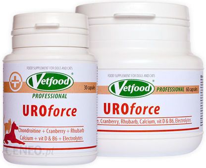 UROforce jest produktem, którego precyzyjnie dobrane składniki regulują oraz wspomagają funkcje układu moczowego, zwłaszcza w schorzeniach dolnych dróg moczowych i u zwierząt z przewlekłą niewydolnością nerek.W składzie UROforce znajdują się:Wapń – pomaga regulować gospodarkę wapniowo – fosforową, często zaburzoną u osobników z przewklekłą niewydolnością nerek na skutek ograniczonej zdolności do usuwania fosforu z organizmu.Witamina D – uzupełnia jej możliwy niedobór w organiźmie. U osobników z przewlekłą chorobą nerek często diagnozuje się niedobór czynnej postaci witaminy D.Potas – wpływa korzystnie na zachowanie równowagi elektrolitowej.Rzewień – wpływa pozytywnie na obniżenie ilości zmian sklerotycznych w kłębuszkach nerkowych, co pomaga spowolnić postęp dolegliwości nerkowych. Dodatkowo wspomaga i stabilizuje stężenie kreatyniny w surowicy, wspiera procesy ograniczające białkomocz i ułatwia utrzymanie stabilnej masy ciała.Żurawina – utrudnia zasiedlenie pęcherza moczowego przez bakterie wywołujące przewlekłe zakażenia dróg moczowych.Chondroityna – wchodzi w skład błony śluzowej pęcherza moczowego. Suplementacja chondoityny istotnie poprawia szczelność tej błony. Witamina B6 – zwiększa odporność organizmu, łagodzi skutki uboczne leków stosowanych w terapii chorób układu moczowego, wspomaga zmniejszenie wydalania kwasu szczawiowego z moczem oraz redukuje ryzyko tworzenia się kamieni szczawianowych w pęcherzu moczowym.Witamina C – w sposób umiarkowany zakwasza mocz, co wpływa na zmniejszenie ryzyka zakażeń bakteryjnych pęcherza moczowego.Przeznaczenie:wspomaganie prawidłowego funkcjonowania układu moczowego u zwierząt z przewlekłą niewydolnością nerek oraz chorobami dolnych dróg moczowych,wspomagająco u osobników z nawracającymi infekcjami pęcherza moczowego,Skład: cytrynian potasu, żelatyna (otoczka), ekstrakt z rzewienia (Rheum palmatum L) (74 mg/kapsułkę), stearynian magnezu, ekstrakt z żurawiny (Vaccinium macrocarpon) (37 mg/kapsułkę), siarczan chondroityny (25 mg/kapsułkę)Dodatki sensoryczne: dwutlenek tytanu (otoczka)Dodatki dietetyczne:1 kapsułka / 1 kgWapń (bisglicynian wapnia) – 98 mg / 94,2 gMagnez (bisglicynian magnezu) – 12,2 mg / 11,7 gWitamina D3 (cholekalcyferol) – 11,2 IU / 10 800 IUWitamina C (kwas askorbinowy) – 4,9 mg / 4,7 gWitamina B6 (chlorowodorek pirydoksyny) – 44,7 µg / 43 mgSkładniki analityczne:Białko surowe: 14,4%Włokno surowe: 1,4%Tłuszcz surowy: 4,3%Popiół surowy: 68,2%Wapń: 8,1%Fosfor: 0,1%Potas: 8,2%Stosowanie:Dziennie zaleca się podawać następujące ilości produktu w trakcie posiłku dla zwierzęcia:Koty: 1 kapsułkaPsy: 25 kg – 6 kapsułkiW razie potrzeby zaleca się otworzyć kapsułkę i wymieszać jej zawartość z ulubionym przysmakiem. Jeśli dieta oparta jest tylko na suchej karmie, należy lekko zwilżyć karmę, tak żeby zawartość kapsułki przylegała do pokarmu i została spożyta przez zwierzę.