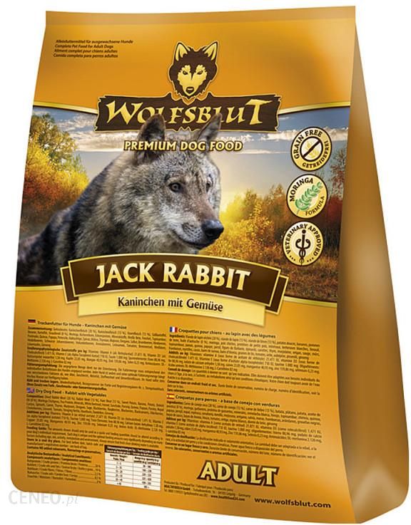 WOLFSBLUT JACK RABBIT to sucha karma dla dorosłych psów wszystkich ras i unikalne połączenie mięsa królika i wybranych roślin leczniczych, z wód, lasów i łąk.Korzyści:mięso królika pochodzenia naturalnego o jakości żywności dla ludziunikalna kombinacja ziół z wód, łąk i lasówwyśmienity smaklekkostrawne jedzenienie zawiera ziaren zbóżbez cukru, soi, wybielaczy, witaminy K3bez dodatków wzmacniających kolor i smakbez sztucznych konserwantówzalecana dla alergikówWOLFSBLUT JACK RABBIT to unikalny suchy pokarm. Receptura karmy WOLFSBLUT JACK RABBIT łączy potrzeby pokarmowe naszych psów z tymi ich przodków wilków. Menu przodków naszych psów składające się głównie z mięsa i ryb, poprzez zjadanie treści żołądkowej ofiar, było uzupełniane owocami lasu i stepu. Karma WOLFSBLUT JACK RABBIT łączy w sobie wysoką zawartość mięsa z kombinacją ziół, z wód, łąk i lasów i innych składników prozdrowotnych. Tak więc, bardzo zdrowa, sucha karma WOLFSBLUT JACK RABBIT jednocześnie chroni i ożywia ciało i umysł zwierzęcia. Zawiera wszystkie niezbędne składniki odżywcze, witaminy i minerały.Niezwykle smakowitaMięso królika stosowane w suchej karmie JACK RABBIT w połączeniu z batatami to prawdziwe doświadczenie smaku.LekkostrawnaMięso królika charakteryzuje wysoka strawność.Nie zawiera zbóżSucha karma dla psa WOLFSBLUT JACK RABBIT jest wolna od ziaren zbóż lecz także od cukru, soi, pszenicy, witaminy K 3, polepszaczy zapachu, koloru i smaku oraz sztucznych konserwantów.Rekomendowana dla alergikówSucha karma dla psa WOLFSBLUT JACK RABBIT jest odpowiednia dla psów wrażliwych i podatnych na alergie. Właściwości składników karm WOLFSBLUT JACK RABBIT mogą przeciwdziałać nietolerancjom pokarmowym.Skład:mięso suszone królika (20%), mięso królika (13%), zając mięso (13%), słodkie ziemniaki, banany, ziemniaki, olej strusia (8%), moringa, ciecierzyca, białko grochu, minerały, białe buraki, koper włoski, topinambur, pasternak, quinoa, papaja, pietruszka, opuncja, szpinak, marchew, tymianek, majeranek, oregano, szałwia, jeżyny, maliny, jagody, czarne porzeczki, jagody bzu czarnego, owoce aronii, siemię lniane, pomidory, pokrzywa, głóg, mniszek lekarski, żeń-szeń;Witaminy:witamin A (w postaci octanu retinylu) 21871 IU witamina D3 (cholekalcyferol) 1471 IU, Witamina E (w postaci octanu a-tokoferolu) 710 IU, tauryna 1000 mg;Pierwiastki śladowe:żelazo 88.96 mg, wapń (bezwodny jodan wapnia) 1,58 mg , miedź 23,05 mg, , cynk 40.93 mg, mangan 159,86 mg, selen 0,23mgAminokwasy:DL- metionina 2,126 mg, L-karnityna 82 mg;Analiza:białko surowe 28%, tłuszcz surowy 19%, włókno surowe 2,5%, popiół 8,5%, wilgotność 8%
